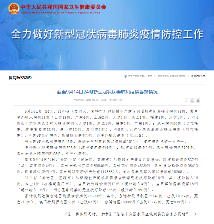 9月14日0—24时,31个省(自治区、直辖市)和新疆生产建设兵团报告新增确诊病例73例。其中境外输入病例23例(云南13例,广东4例,上海2例,天津1例,浙江1例,福建1例,河南1例),含4例由无症状感染者转为确诊病例(天津1例,浙江1例,福建1例,广东1例);本土病例50例(均在福建,其中莆田市33例、厦门市12例、泉州市5例),含9例由无症状感染者转为确诊病例(均在福建)。无新增死亡病例。新增疑似病例1例,为境外输入病例(在上海)。