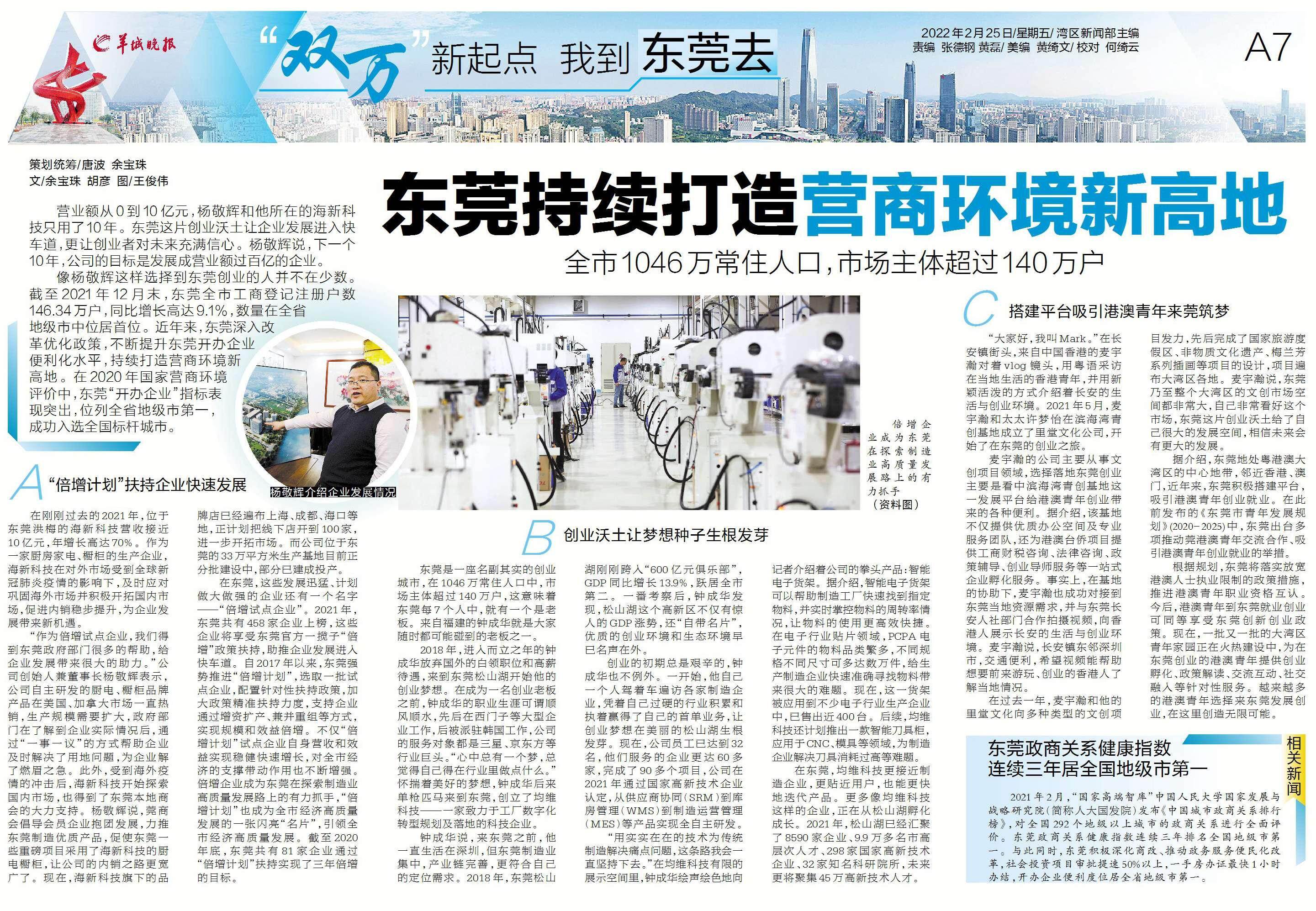 像杨敬辉这样选择到东莞创业的人并不在少数。截至2021年12月末,东莞全市工商登记注册户数146.34万户,同比增长高达9.1%,数量在全省地级市中位居首位。近年来,东莞深入改革优化政策,不断提升东莞开办企业便利化水平,持续打造营商环境新高地。在2020年国家营商环境评价中,东莞“开办企业”指标表现突出,位列全省地级市第一,成功入选全国标杆城市。