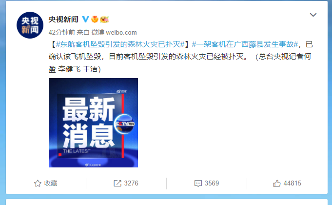 【东航客机坠毁引发的森林火灾已扑灭】一架客机在广西藤县发生事故,已确认该飞机坠毁,目前客机坠毁引发的森林火灾已经被扑灭。(总台央视记者何盈 李健飞 王洁)