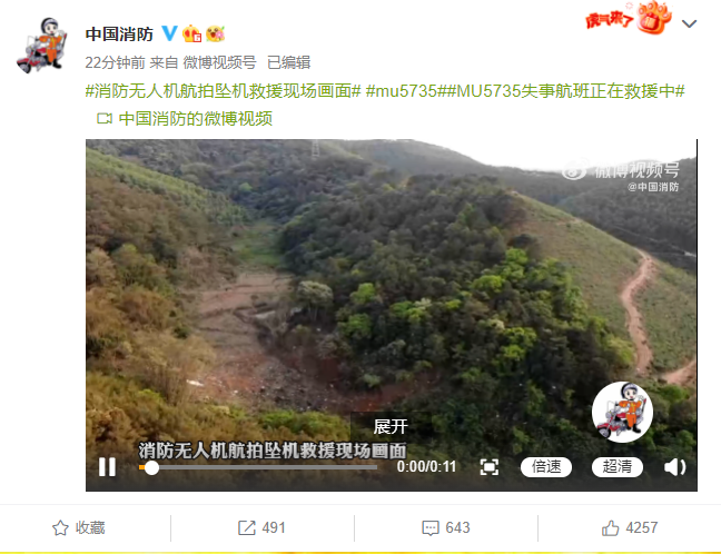 今日,东方航空MU5735航班执行昆明—广州任务时,在广西梧州市上空失联并坠毁。救援现场,消防救援人员搭建卫星通讯便携站,同时利用无人机进行全景拍摄,为搜救提供图传方位信息。消防无人机航拍坠机救援现场画面↓↓↓