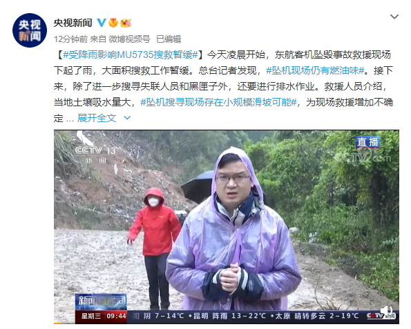今天凌晨开始,东航客机坠毁事故救援现场下起了雨,大面积搜救工作暂缓。记者发现,坠机现场仍有燃油味。接下来,除了进一步搜寻失联人员和黑匣子外,还要进行排水作业。救援人员介绍,当地土壤吸水量大,坠机搜寻现场存在小规模滑坡可能,为现场救援增加不确定性。请务必注意安全!