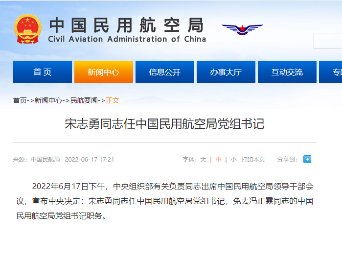 2022年6月17日下午,中央组织部有关负责同志出席中国民用航空局领导干部会议,宣布中央决定:宋志勇同志任中国民用航空局党组书记,免去冯正霖同志的中国民用航空局党组书记职务。