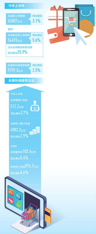 原标题:上半年,全国实物商品网上零售额同比增长5.6%