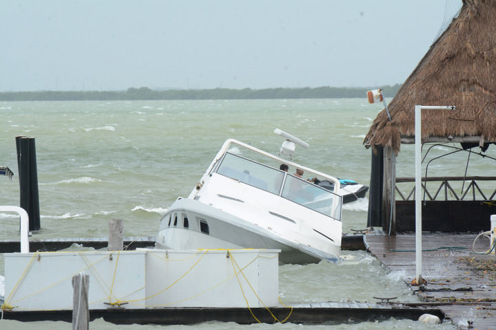 这是7月5日在墨西哥金塔纳罗奥州坎昆拍摄的飓风登陆后的码头。新华社发(阿道弗·哈索)