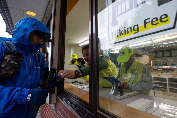 7月1日,在日本山梨县富士山吉田路线五合目登山口购票处,工作人员为游客戴上象征已支付登山通行费的腕带。新华社记者张笑宇摄