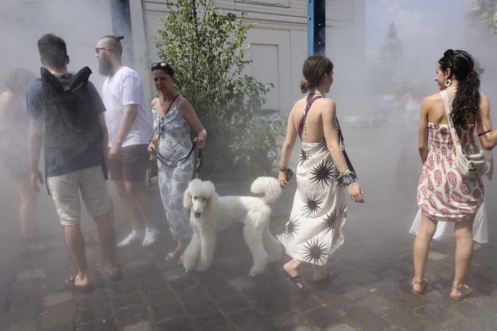 7月11日,在匈牙利布达佩斯,人们在喷雾装置中感受清凉一刻。新华社发(弗尔季·奥蒂洛摄)