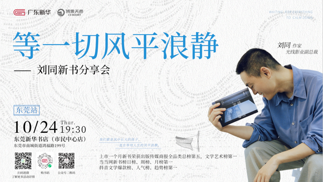 10月24日(周四)19:30,东莞新华书店(市民中心店)特别邀请刘同做客现场,与读者朋友们,聊聊这本全新蜕变之作,谈谈如何“跨越飓风”寻找内心的“风平浪静”。