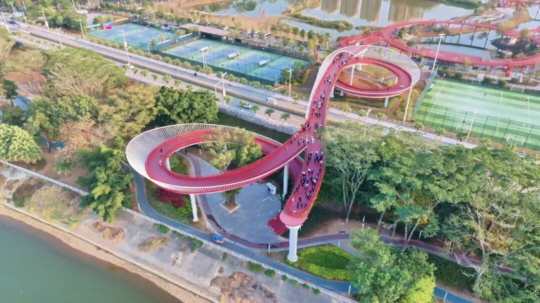 最后,调研组来到滨江体育公园,调研镇中心区扩容提质与人居环境提升成效。依托东江滨水优势打造的滨江体育公园,以“慢行贯通、活力赋能”为理念,14.4公里绿道串联全域慢行系统,核心段“网红桥”成为东莞滨江标志性景观,日均接待超1200人次,亲子设施成为市民休闲打卡热点。该项目成功入选省级绿美碧带,调研组点赞其将河岸空间升级为复合型生态休闲场所的做法,认为可为全市城乡滨水空间改造提供可复制、可推广的经验。