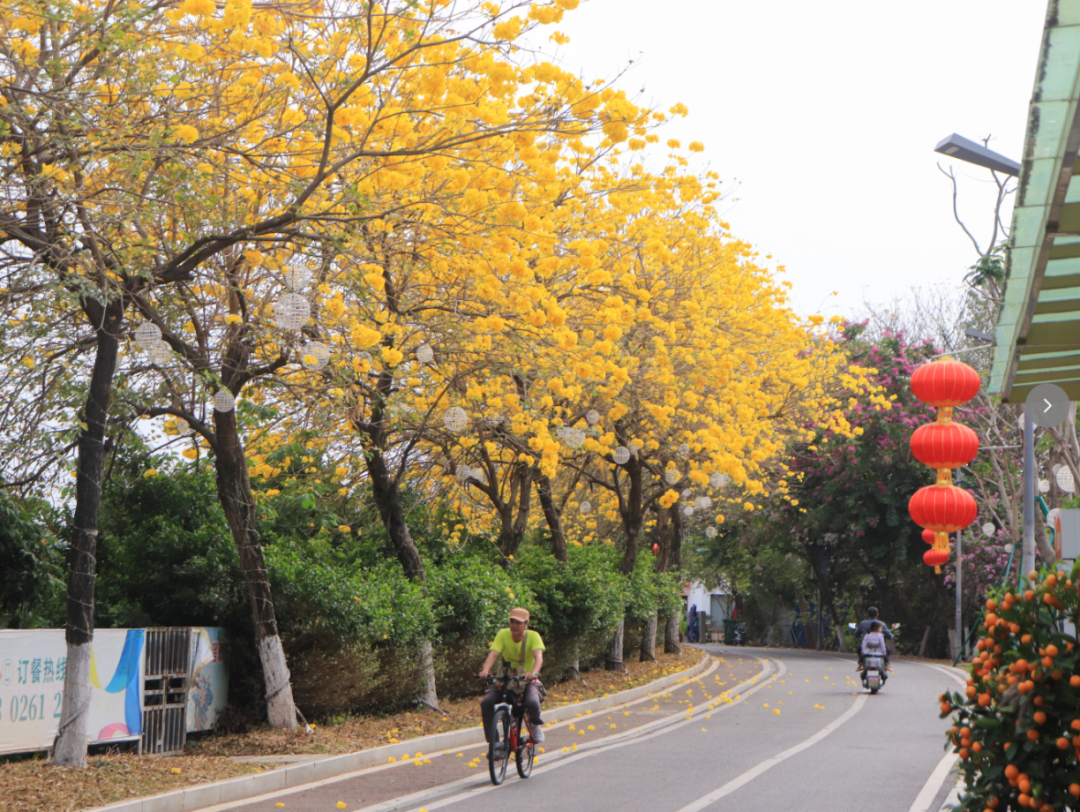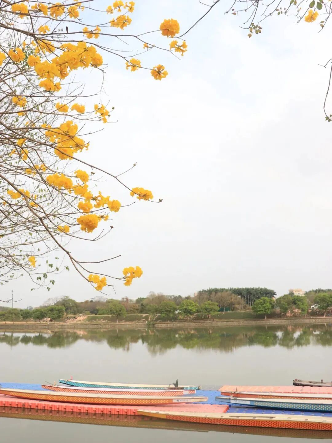 漫步河堤,抬眼满是春意浪漫。黄花风铃木率先奏响春的序曲,簇簇金黄挂满枝头,在阳光下熠熠生辉;紫荆花开得密密匝匝,粉白相间,随风洒落一地花瓣雨;三角梅攀上围墙,垂下紫红色的瀑布;两株高大的木棉树擎起满树“红灯笼”,英雄花的气韵与江水相映成趣。