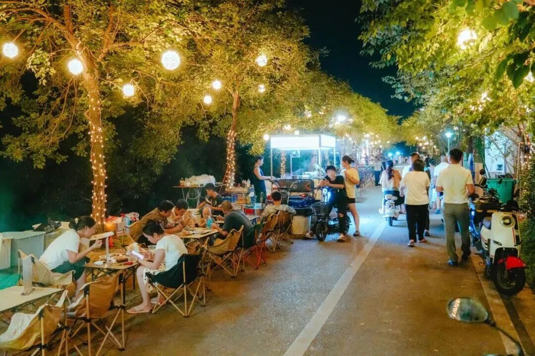 热爱传统文化的游客,还能顺路去万江枝昌龙舟训练基地感受万江人奋勇争先的龙舟精神,再前往以龙舟为餐厅主题的幸运农庄品尝地道的粤菜。走累了,“悦小馆”的河鲜正当时,伴着窗外灯影花色,尝一口水乡风味;夜幕降临,沿河路段的夜市灯火通明,烤生蚝、瓦岗鸡翅滋滋作响,手作小摊亮起串灯,烟火气与花香交织,把春夜烘托得格外鲜活。