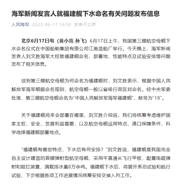 6月17日上午,我国第三艘航空母舰下水命名仪式在中国船舶集团有限公司江南造船厂举行。当天晚上,海军新闻发言人刘文胜海军大校就福建舰命名、部署地、性能特点及试验安排等问题发布了相关信息。