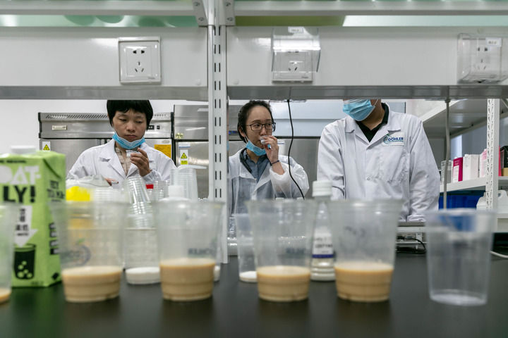 ▲7月21日,在德乐食品饮品配料(上海)有限公司应用研发实验室,研发人员对新配方样品进行“口味评测”